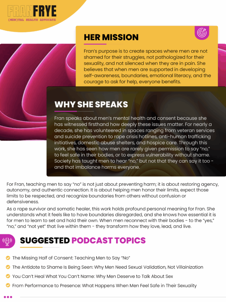 Fran is a Sex Educator, Counselor & Somatic Sex Practitioner who supports men at the intersection of sexuality, trauma and compassion. Her work helps men move beyond limiting stereotypes and shame, offering a grounded, human approach rooted in empathy and the belief that no one is broken. Alongside her clinical work, Fran volunteers on a rape crisis hotline, serves Veterans and their families, sits with hospice patients, and contributes to anti–human trafficking efforts – experiences that deeply shape how she shows up in the world. She is also the creator of Take a Bubble Break, a simple tool that brings play and nervous system regulation into hard moments. As a rape survivor and somatic healer, Fran is especially passionate about helping men reconnect with their bodies, boundaries, and inner “yes” and “no,” so they can live, love, and lead with greater integrity and connection.